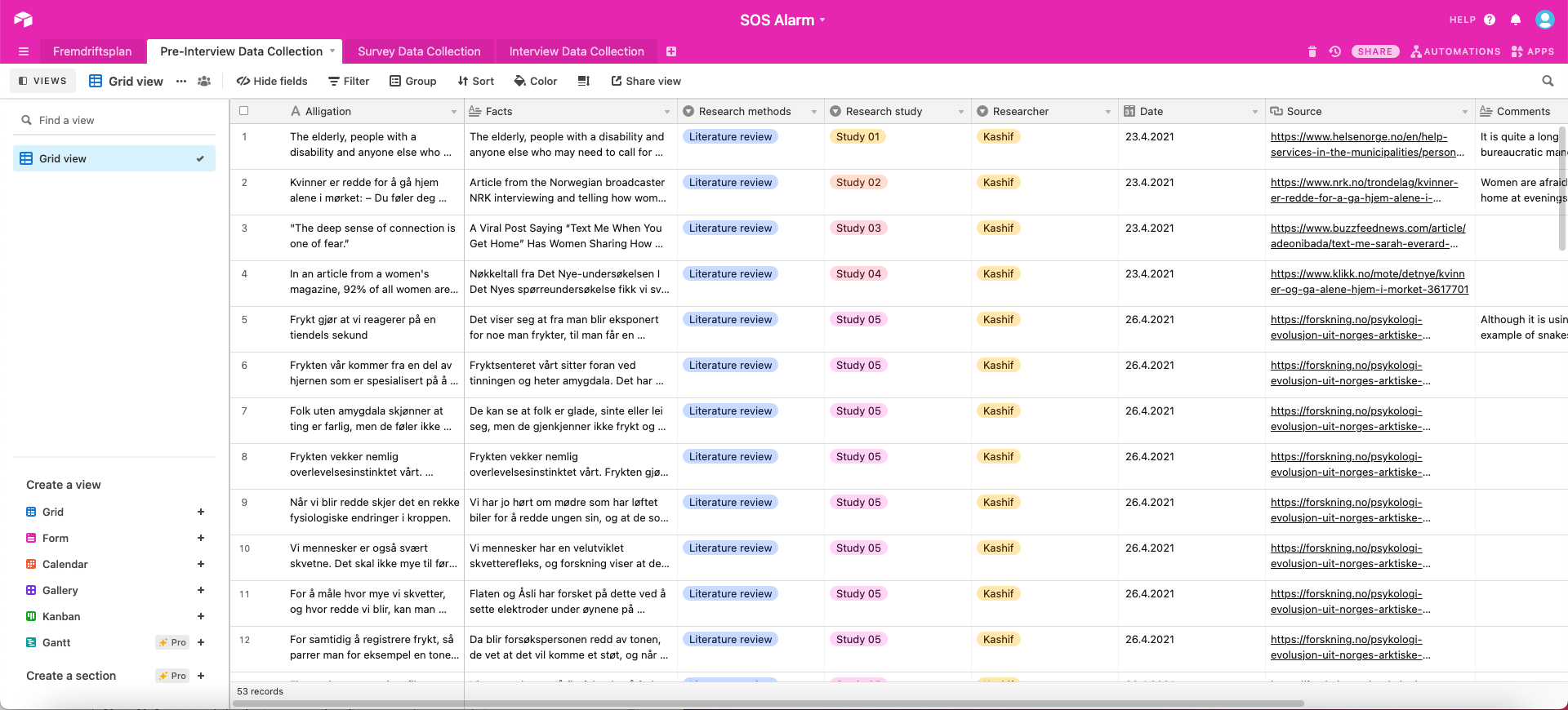 In the first phase of the research project, I conducted a digital secondary data collection. I gathered information from reputable organizations and news articles. The collected unbiased facts and useful data were then inserted in Airtable to create an organized literature review.